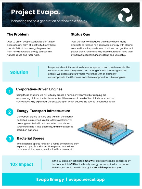 Our end goal is to ensure that there is no more need for fossil fuels as this energy gathering method starts to become more prominent. We hope that this technology will eventually benefit people all over the world who do not have the access to other sources of energy that many are accustomed to.